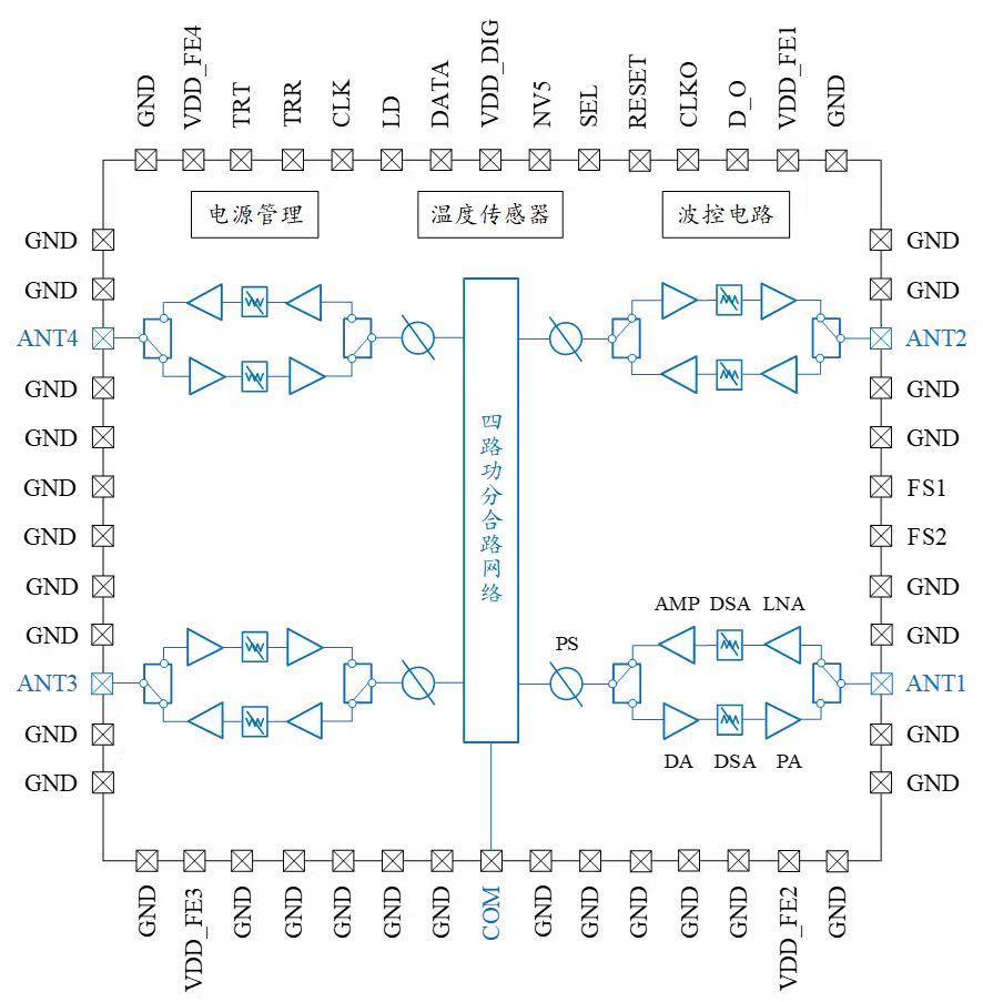 ARW9654是一款四通道高集成度波束赋形收发芯片,有1个公共射频端口和4个收发共用天线端口。工作频率覆盖12~18GHz,支持TDD时分双工模式。芯片包含4个收发通道和对应的功率合成网络。每个收发通道都集成了性能优异的射频开关、功率放大器、限幅低噪声放大器、数字移相器、数控衰减器等功能电路。除了集成SPI接口和波控电路以外,芯片还内置了电源管理和温度传感器,辅助提升芯片性能的温度稳定性。该芯片使用FC-LGA封装工艺,封装后尺寸为7.5mm×7.5mm×0.76mm。散热方向设计在芯片顶部,有助于有源相控阵天线的散热和集成,降低系统重量和成本,易于批量制造。